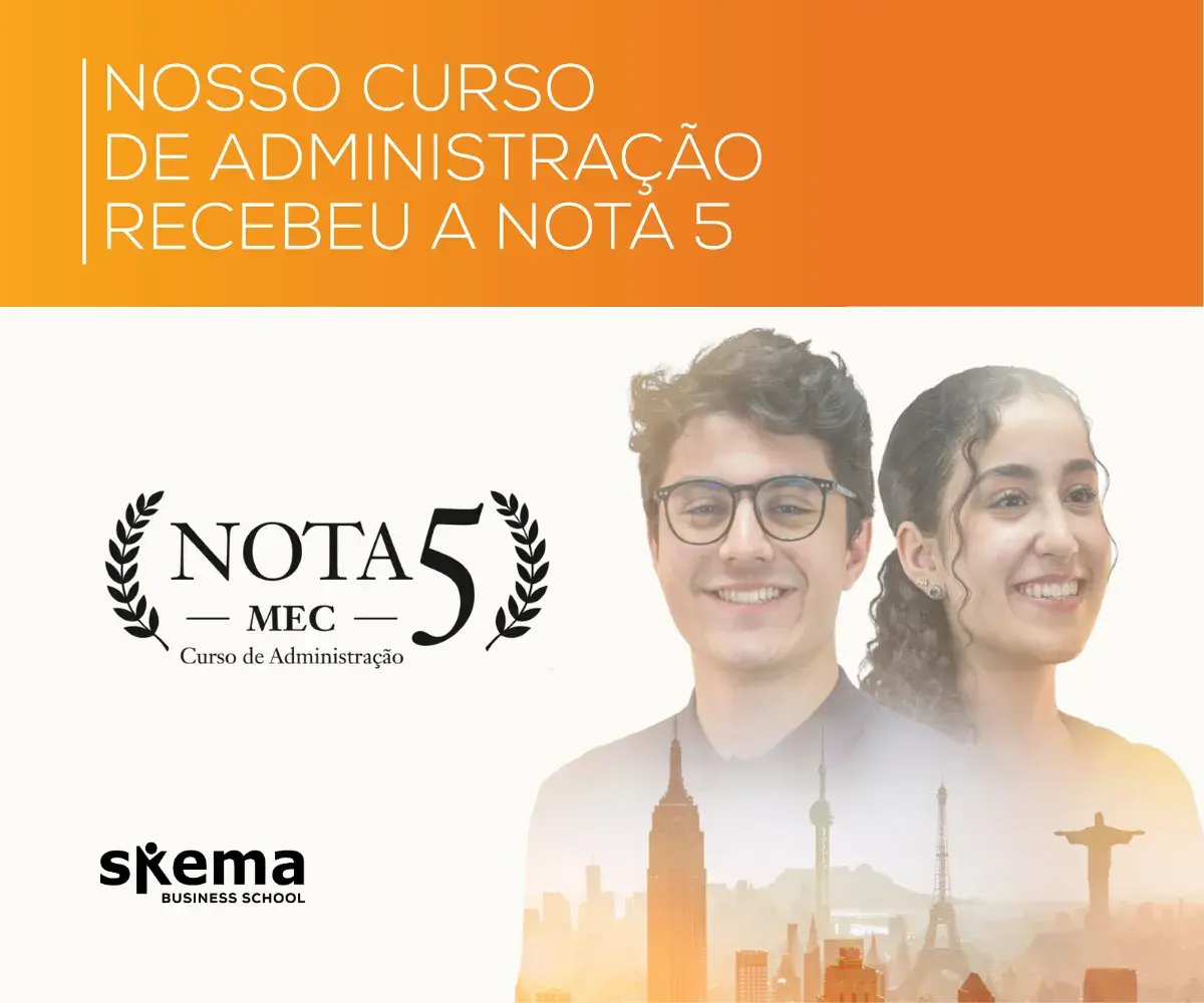 A SKEMA Business School tem a satisfação de compartilhar com toda a comunidade acadêmica a conquista da nota máxima 5 no processo de renovação de reconhecimento do curso de Administração junto ao MEC.