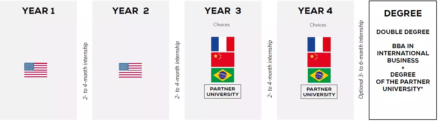 The intercultural experience of all our campuses combined with a year of studying abroad strengthens our students' perspective, expertise, and knowledge. They finish their program in 4 years and have the opportunity to earn a second degree at one of our partner institutions.
