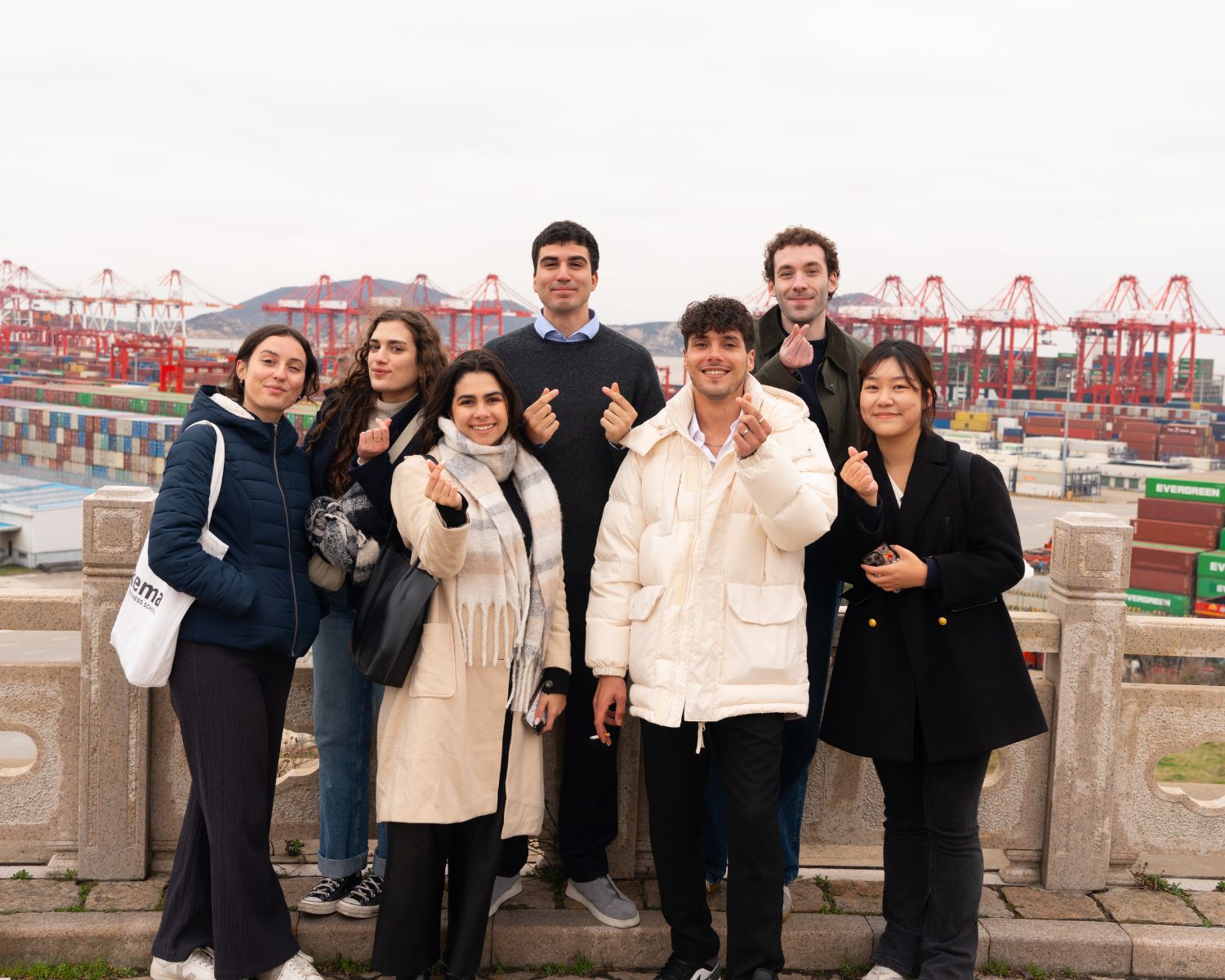 The day began at the Yangshan Port Exhibition Zone, where port staff introduced students to the port’s history, core operations, and the role of technological innovation in enhancing logistics efficiency. A car tour of the port allowed students to observe cargo transportation, loading processes, and automated operations at the world’s busiest deep-water port. A stop at the observation deck provided a panoramic view of the port’s impressive container throughput and bustling activities.