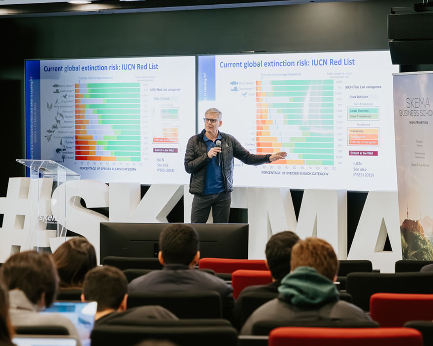 La conférence, intitulée "Interactions between the biodiversity and climate crises: addressing common causes and implementing solutions with co-benefits", a réuni un public varié composé d’étudiants du programme Grande Ecole en première année, d’autres étudiants en master, ainsi que de plusieurs professeurs et membres du staff de SKEMA Business School. Parmi les enseignants présents figuraient Eva Niesten, professeure titulaire en stratégie et développement durable et directrice du centre de recherche SKEMA Centre for Sustainability Studies, et Berill Blair, professeure associée en gouvernance des ressources et durabilité et membre de ce même centre de recherche.